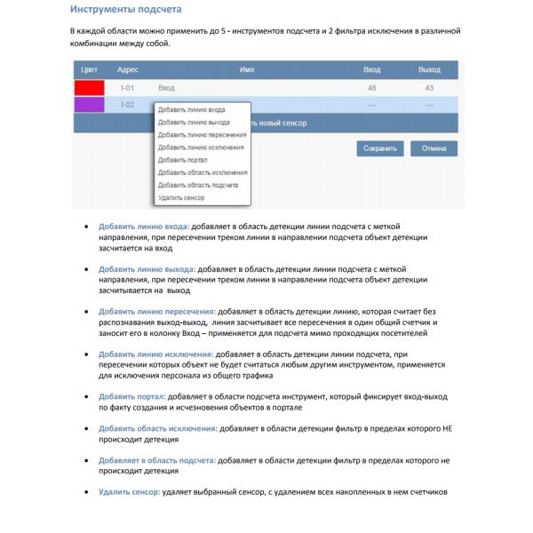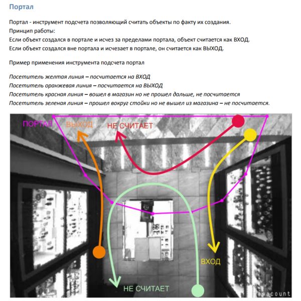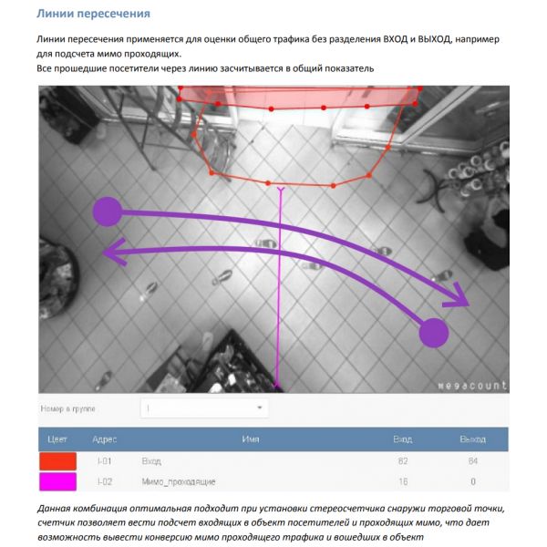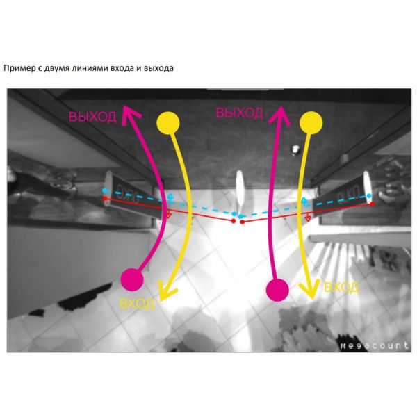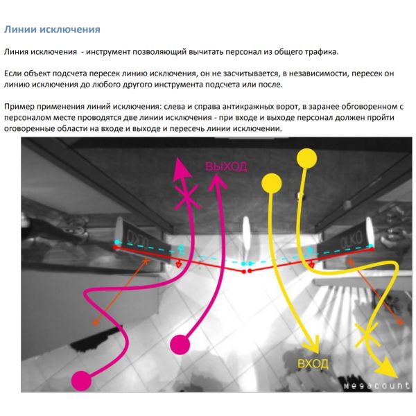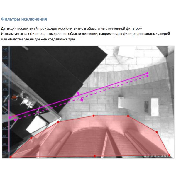 Десять независимых зон подсчёта, на каждую из которых можно назначить свою метрику. Линии исключения при проходе через которые подсчет не производится (для исключения персонала)