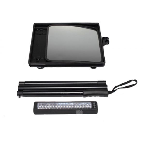 Подробное описаниеЗеркало досмотровое подкатное предназначено для визуального обследования днища транспортных средств на наличие посторонних предметов. Зеркало состоит из передвижной каретки на четырех колесах с закрепленным на ней сферическим зеркалом, съемным светодиодным осветителем со ступенчатой регулируемой яркостью освещения, рукояткой-держателем. Источником питания для светодиодной подсветки служат батареи размера ААА в количестве 6 штук. Длительность беспрерывной работы освещения составляет более 6 часов.