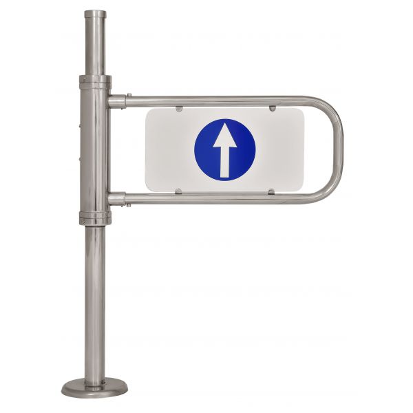 Подробное описаниеКалитка представляет собой вертикальную стойку из трубы диаметром 60 мм и высотой 1095 мм. Часть стойки, в которой расположен механизм, имеет диаметр 90мм. Внизу стойки расположен фланец диаметром 190 мм, на котором имеются 3 отверстия диаметром 11мм для крепления стойки калитки к полу. Сверху фланец закрывается декоративным колпаком из нержавеющей стали, скрывающим фланец и крепежные болты. На стойке калитки расположен поворачивающийся цилиндр, в котором находится механизм возврата дуги. На нем может устанавливаться рукоятка стопора, позволяющего фиксировать дугу в закрытом положении. Для крепления к стойке труб ограждений используется специально разрезное кольцо, в которое вставляются поперечные трубы может вставляться в муфту и фиксируются винтом. Калитка укомплектована дугой из нержавеющей стали с пластиковой вставкой. Ширина калитки с установленной дугой - 825 мм. Диаметр трубы из которой сделана дуга - 32 мм. Стандартный размер дуги - 660х280 мм. При необходимости возможно изготовление дуг других размеров. Дуга крепится к стойке калитки с помощью узла, представляющего собой два прочных стальных стержня диаметром 29 мм, на которые дуга одевается и фиксируется винтами М8. В стандартном исполнении дуга калитки хромирована а стойка окрашена порошковой эмалью в цвет "серебряный антик". Также стойка калитки может быть окрашена в любой цвет по RAL или хромирована. Материал из которого изготовлена вставка в стандартном варианте - ПВХ пластик белого цвета, толщиной 4 мм. В стандартном варианте на вставке с обеих сторон нанесен информационный знак - белая стрелка на синем. Знаки наносятся методом шелкографии. Сверху на изображение наклеивается защитная прозрачная пленка.