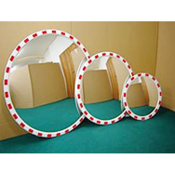 Зеркало обзорное для улицы с красно-белой световозвращающей окантовкой эффективно применяется при просмотре закрытых зон при скорости движения до 50 км/ч.