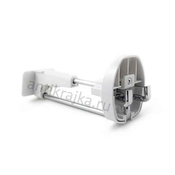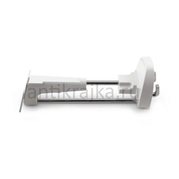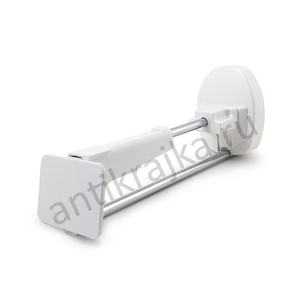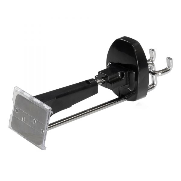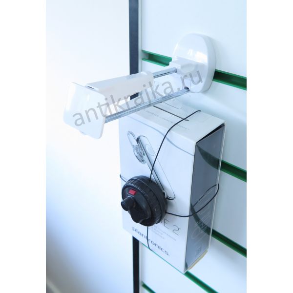 Крючок содержит замок для защиты товара, закрепленного на крючке. Крепление к стеллажу осуществляется пластиковой накладки..