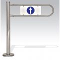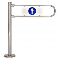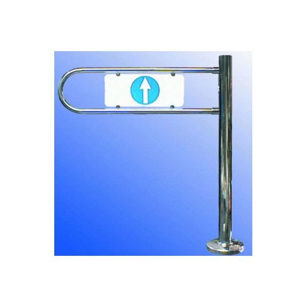 Самая простая из механических калиток с механическим доводчиком. Калитка дешевле аналогичных польских и турецких аналогов и в то же время значительно надежнее и элегантнее. Калитка представляет собой вертикальную стойку из хромированной трубы диаметром 60 мм и высотой 915 мм. Внизу стойки расположен фланец диаметром 190 мм, на котором имеются 3 отверстия диаметром 11мм для крепления стойки калитки к полу. Сверху фланец закрывается декоративным колпаком из нержавеющей стали, скрывающим фланец и крепежные болты. Оригинальной особенностью калитки является применение резинового демпфера, расположенного внизу стойки на фланце. Этот демпфер обеспечивает остановку дуги после закрытия без удара и без раскачивания стойки, долговечную работу калитки. Так как корпус калитки вращается вместе с дугой, то ограждения непосредственно к стойке не присоединяются. Калитка укомплектована дугой из нержавеющей стали с пластиковой вставкой. Ширина калитки с установленной дугой - 850мм. Диаметр трубы из которой сделана дуга - 25мм. Стандартный размер дуги - 700х183мм. При необходимости возможно изготовление дуг других размеров. Дуга крепится к стойке калитки с помощью узла, представляющего собой два прочных стальных стержня диаметром 21.5 мм, на которые дуга одевается и фиксируется винтами М8. Материал из которого изготовлена вставка в стандартном варианте - ПВХ пластик белого цвета, толщиной 4мм. На вставке нанесены информационные знаки: с одной стороны изображена белая стрелка на синем круге, на другой стороне - белый прямоугольник на красном круге. Знаки наносятся методом шелкографии. Сверху на изображение наклеивается защитная прозрачная пленка.