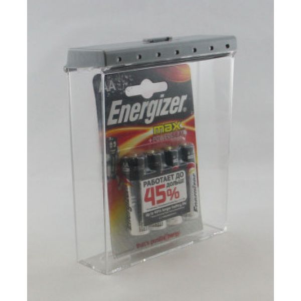 Защитный бокс с прорезью для блистерных упаковок. Подходит для упаковок с батарейками, сменными лезвиями для бритв, косметических средств и др. Изготовлен из прозрачного ударопрочного пластика. Цвет крышки серый.