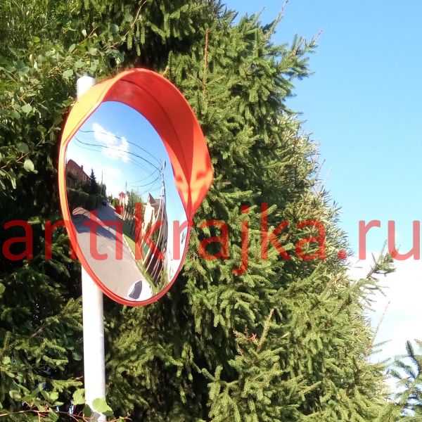 Дорожное сферическое зеркало с козырькомДорожное зеркало закреплено на на установленном нами столбе для обеспечения безопасного выезда из посёлка. Подмосковье, 2017 г.